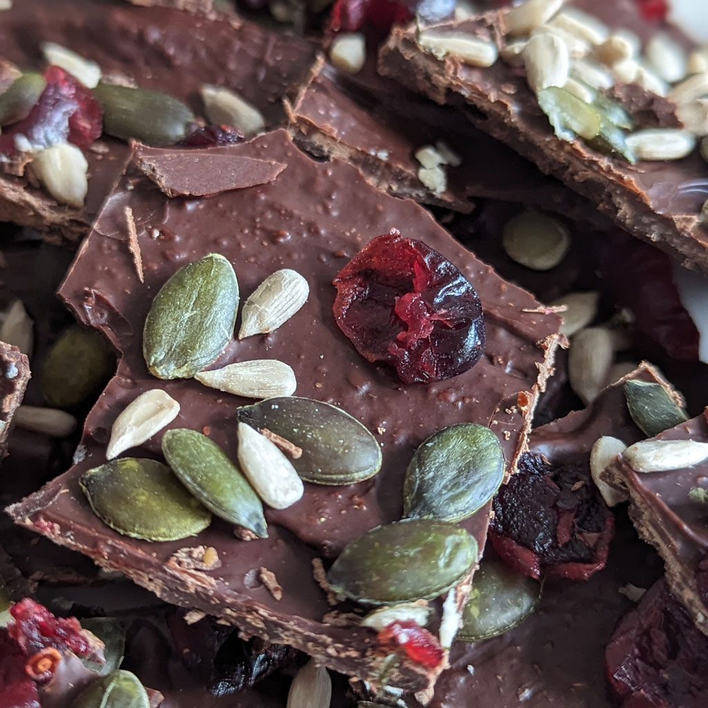 This is so easy to make and satisfies any chocolate craving. Taking 1 bar of dark chocolate, melt it down (I use the microwave) and simply spread it thinly on some greaseproof paper. Optional extra is add some milled seeds into the melted chocolate, I have used flaxseed in the past and it works well. Once it’s spready thinly, scatter your favourite toppings; pumpkin seeds, sunflower seeds, dried cranberries, pecans, cashews, peanuts – I personally go for the protein in seeds and nuts but I have also been known to add some popcorn and marshmallows! Let it all set for a little bit then break into squares and store in an air tight container in the fridge. Sometimes it will last a week in our house, but not often!!!